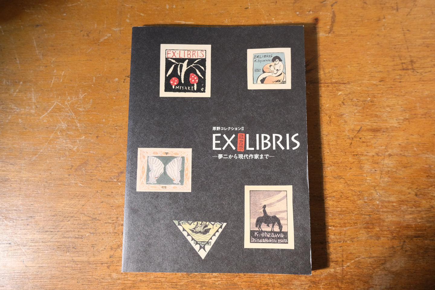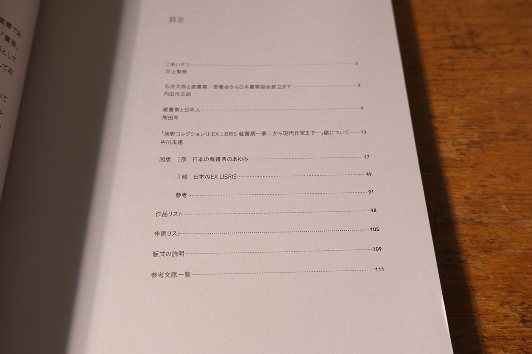 展覧会の図録。Ex Librisとは蔵書票のことを指す。本書では蔵書票の収集家として知られる原野賢吉氏のコレクション(関西学院大学所蔵)より大正から現代に至る蔵書票を紹介。竹久夢二、棟方志功、川上澄生、武井武雄、池田満寿夫ら作家たちの蔵書票と「日本蔵票会」「日本蔵書票協会」発行の作品を収録。